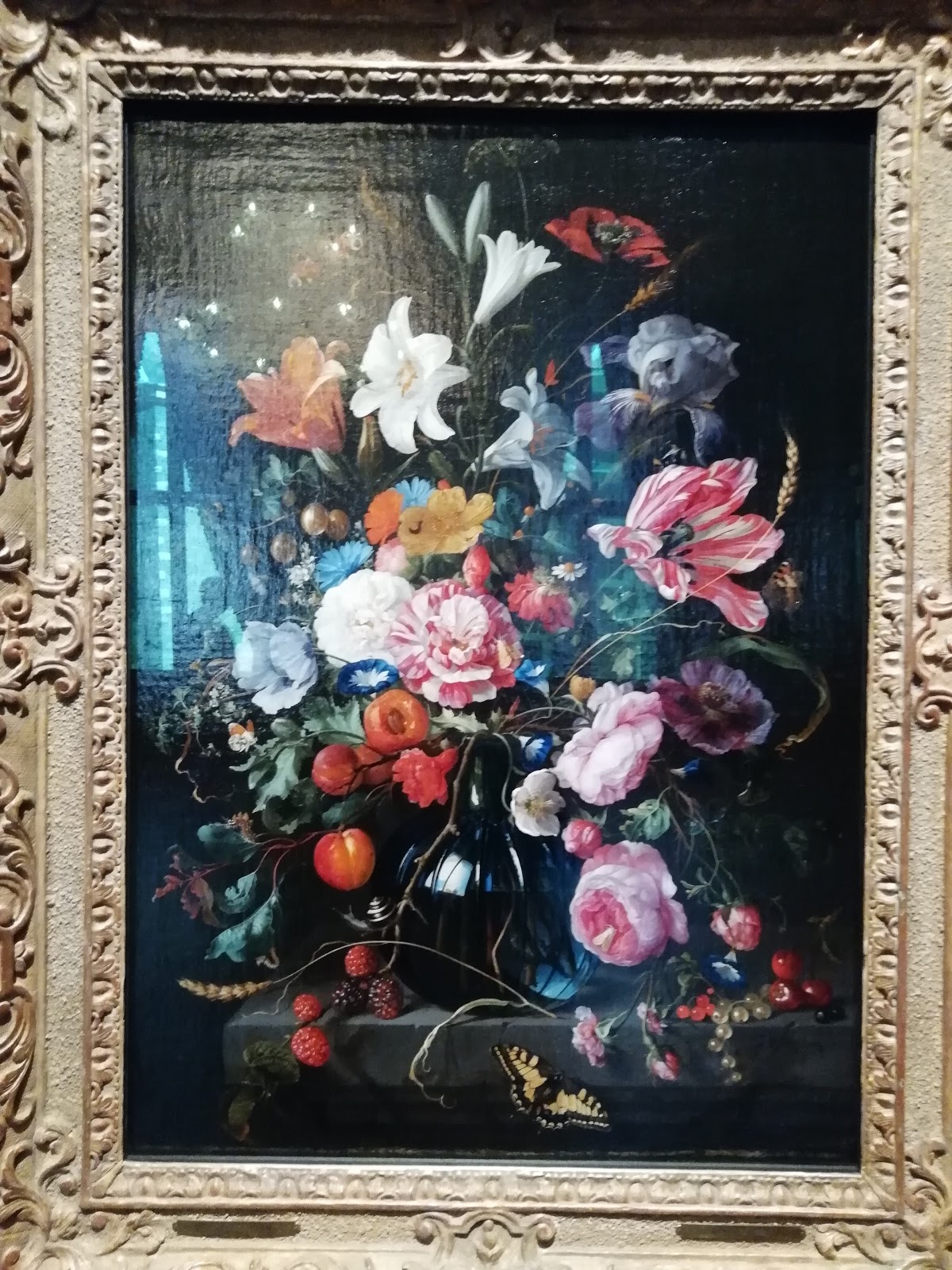 一個特別的細節是玻璃花瓶中的反射,通過工作室窗口顯示多雲的天空和窗台上的一些物體。