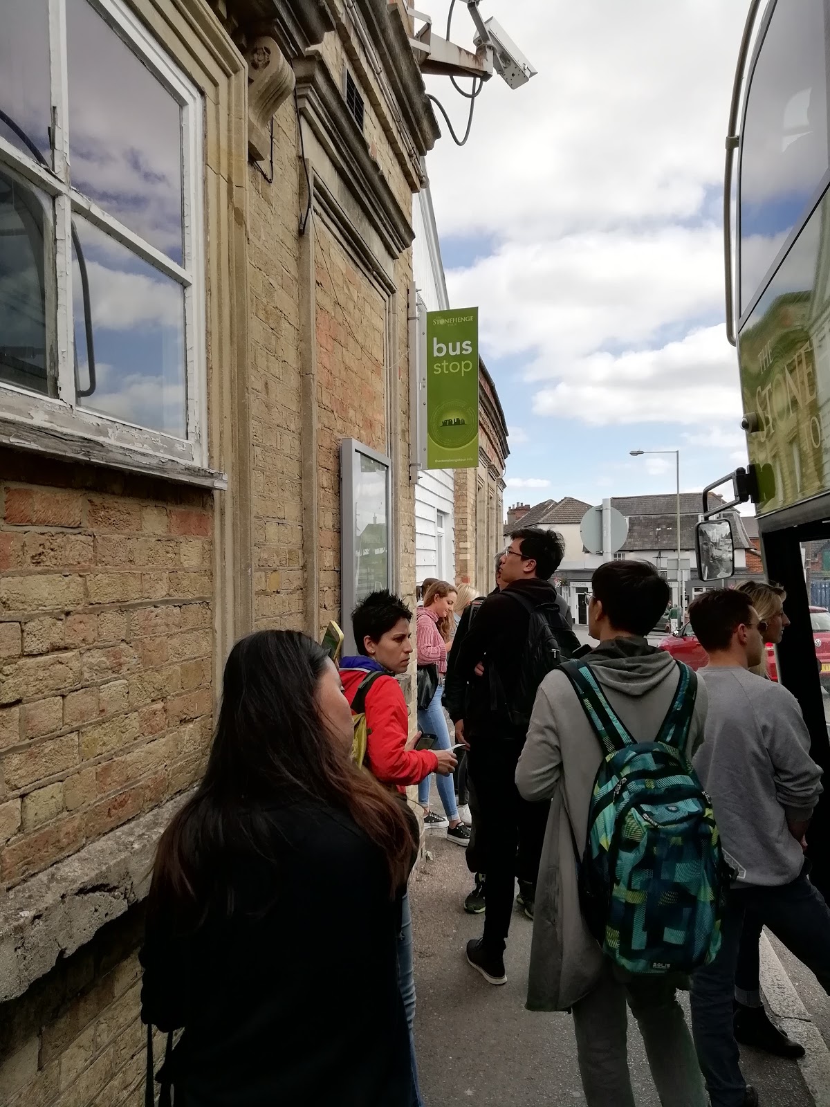 一出車站左手邊就看到一臺綠色的公車停在公車站,車上寫著巨石陣之旅,