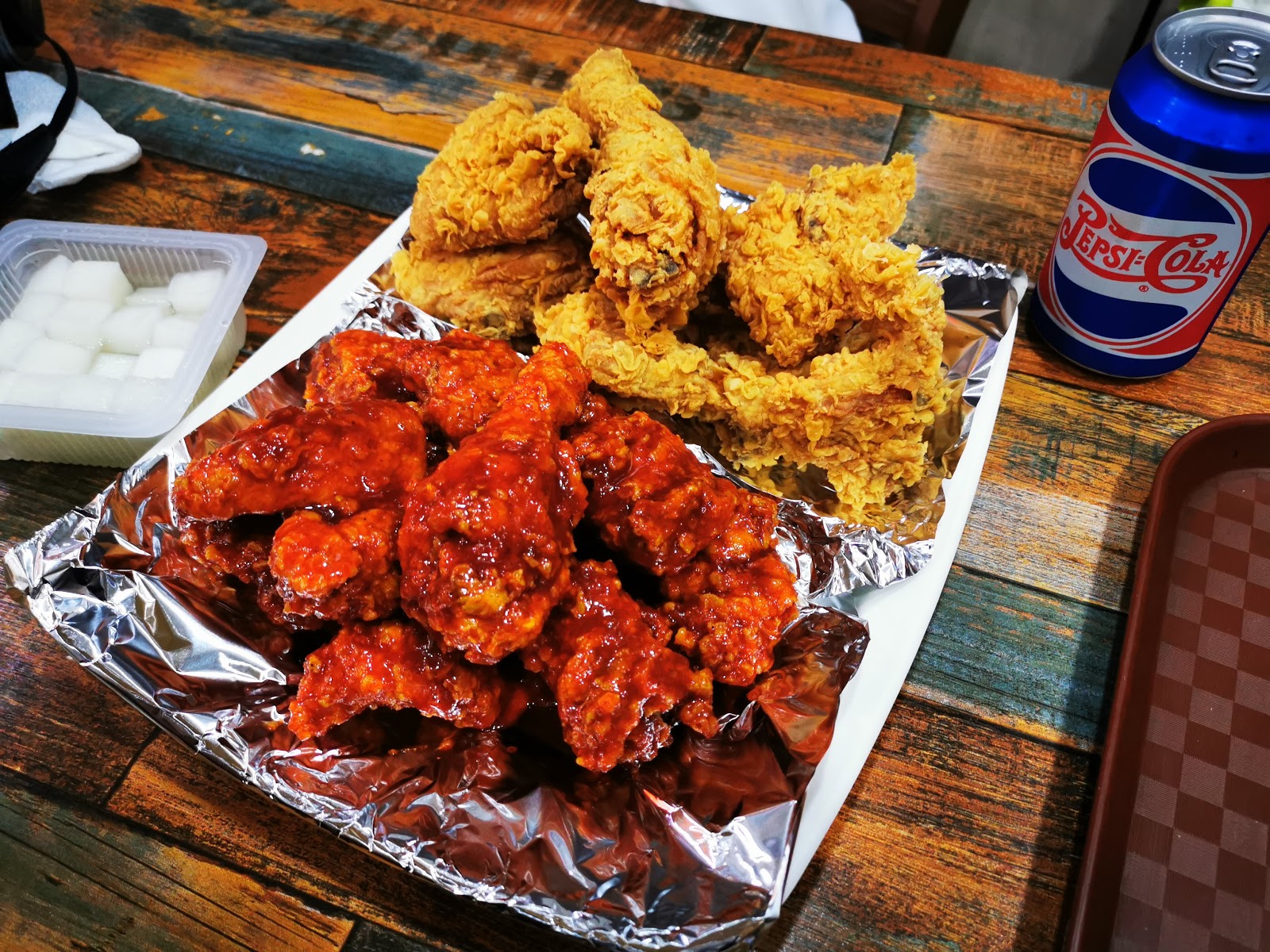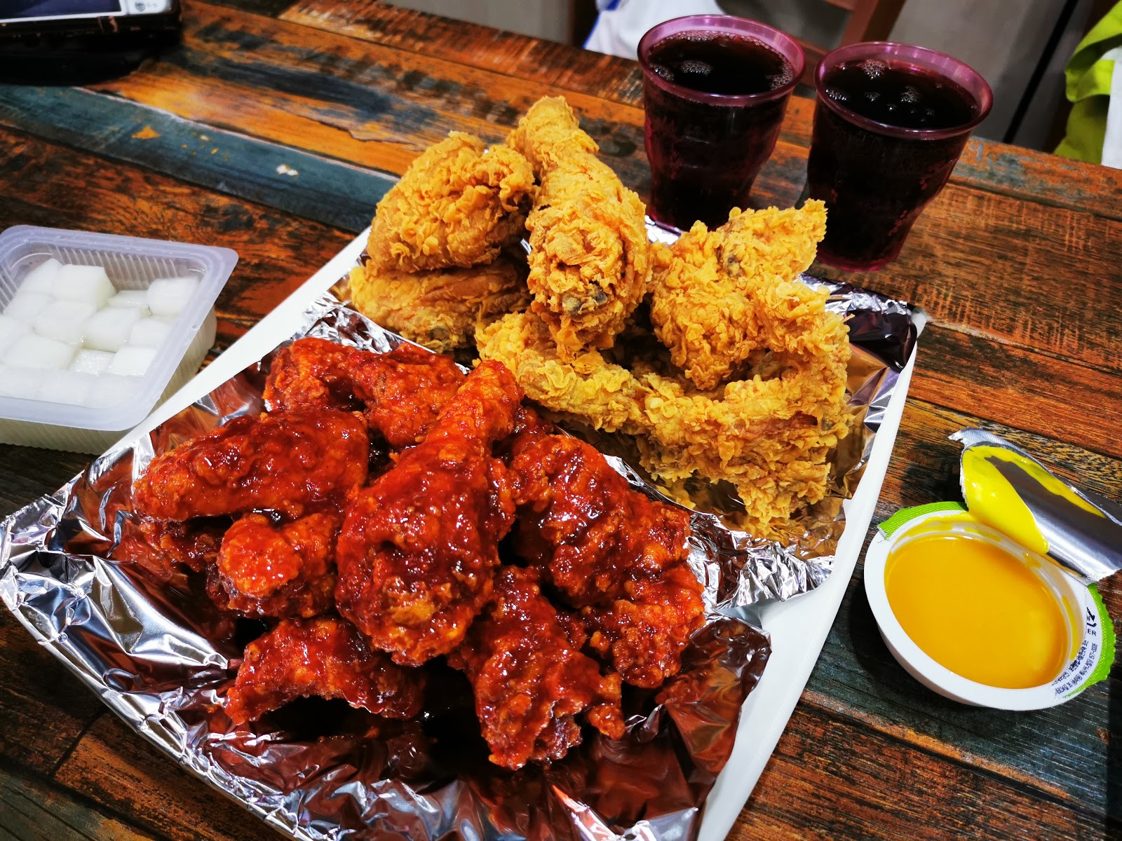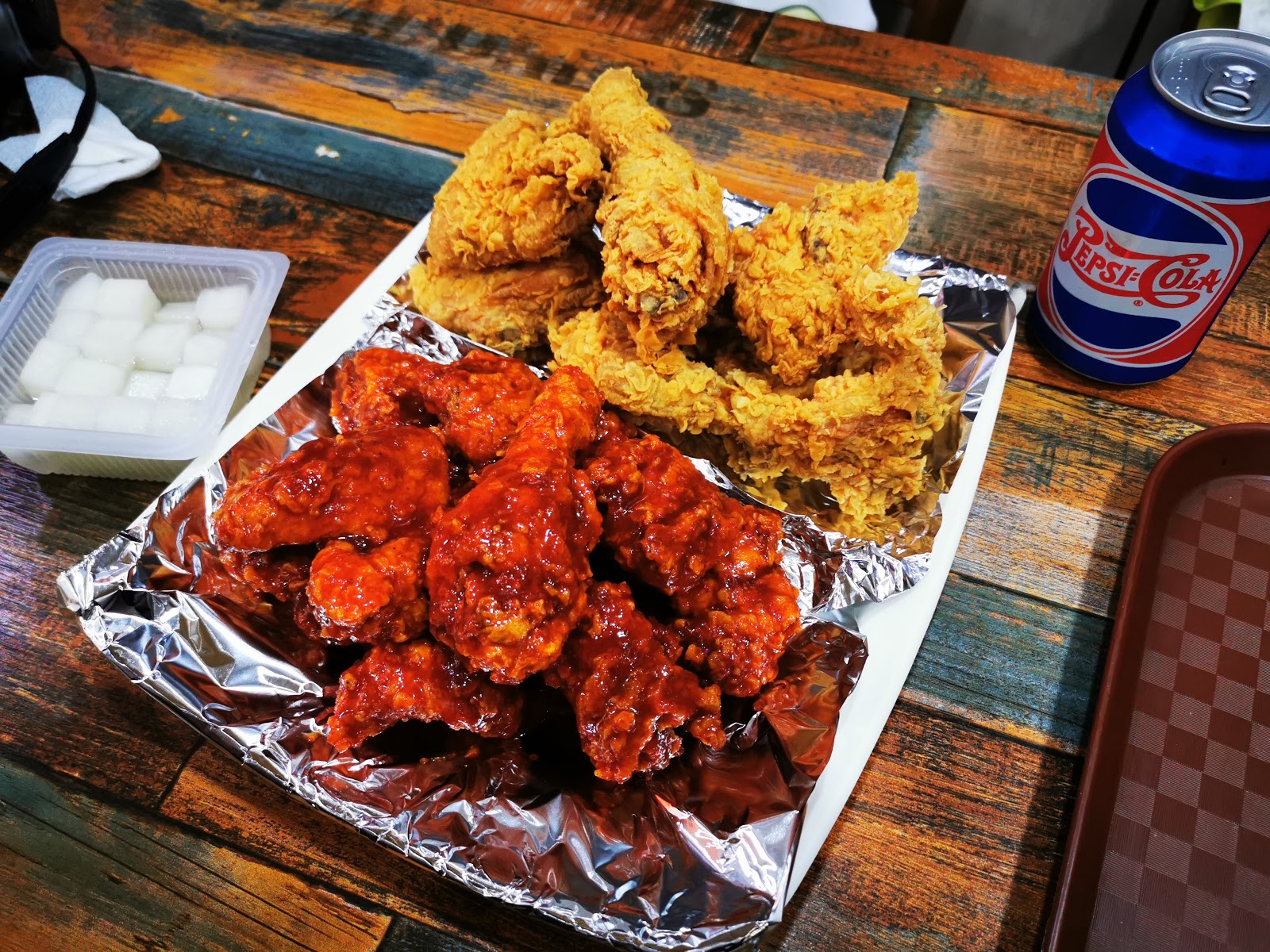 炸雞+裹甜辣醬的炸雞各半。