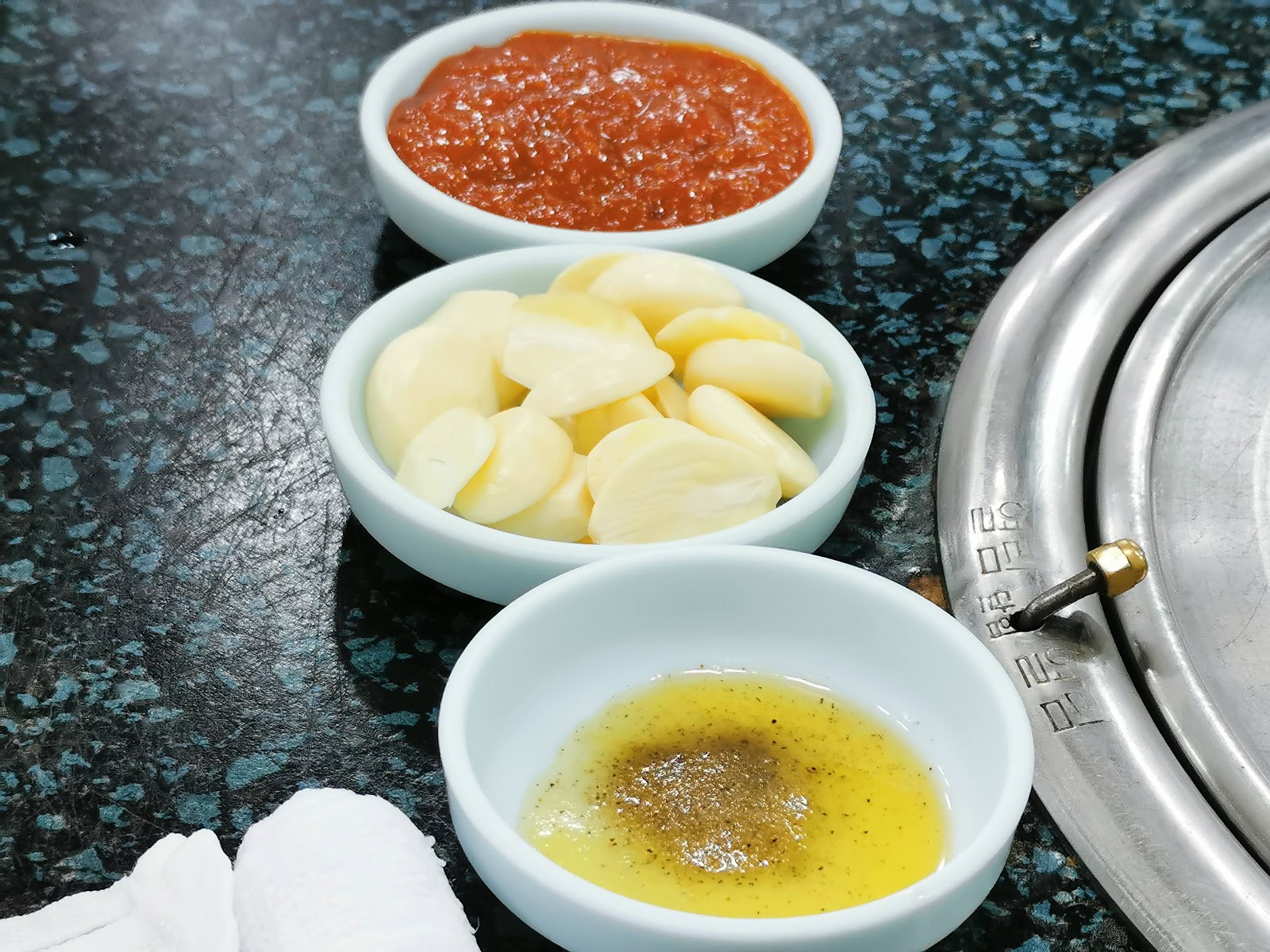 (上)韓式辣醬;(中)蒜頭;(下)椒鹽醬