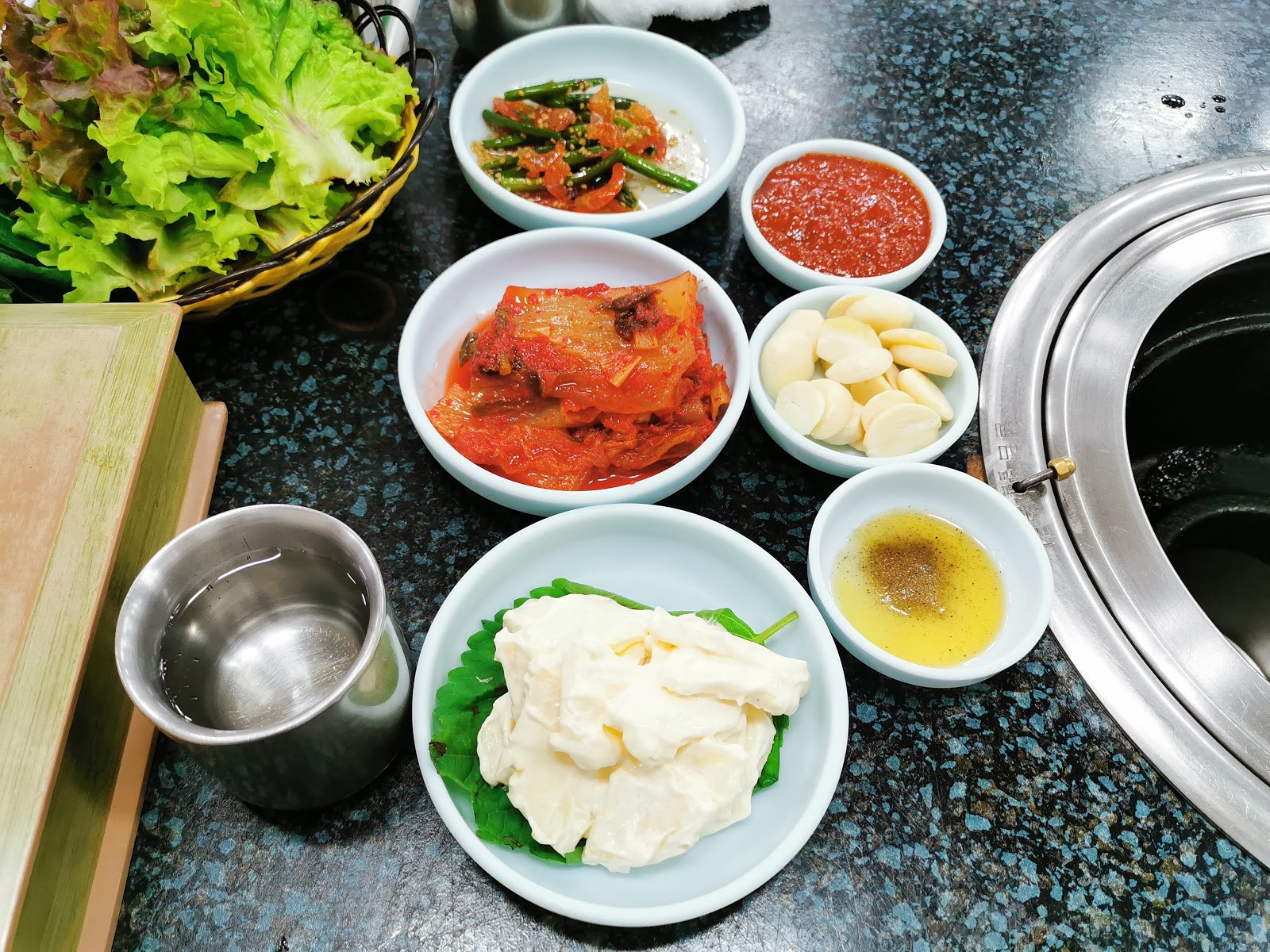 在台灣吃韓國烤肉的生菜都小小的,這裡超大片的。