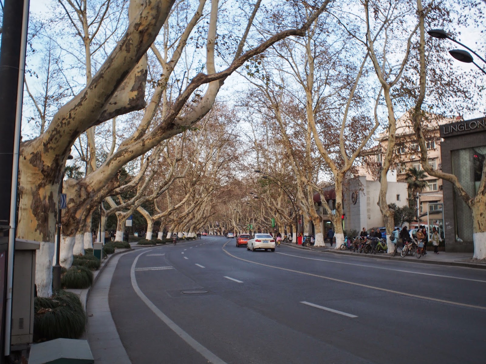 冬季梧桐只剩白色枯枝,更添美感。