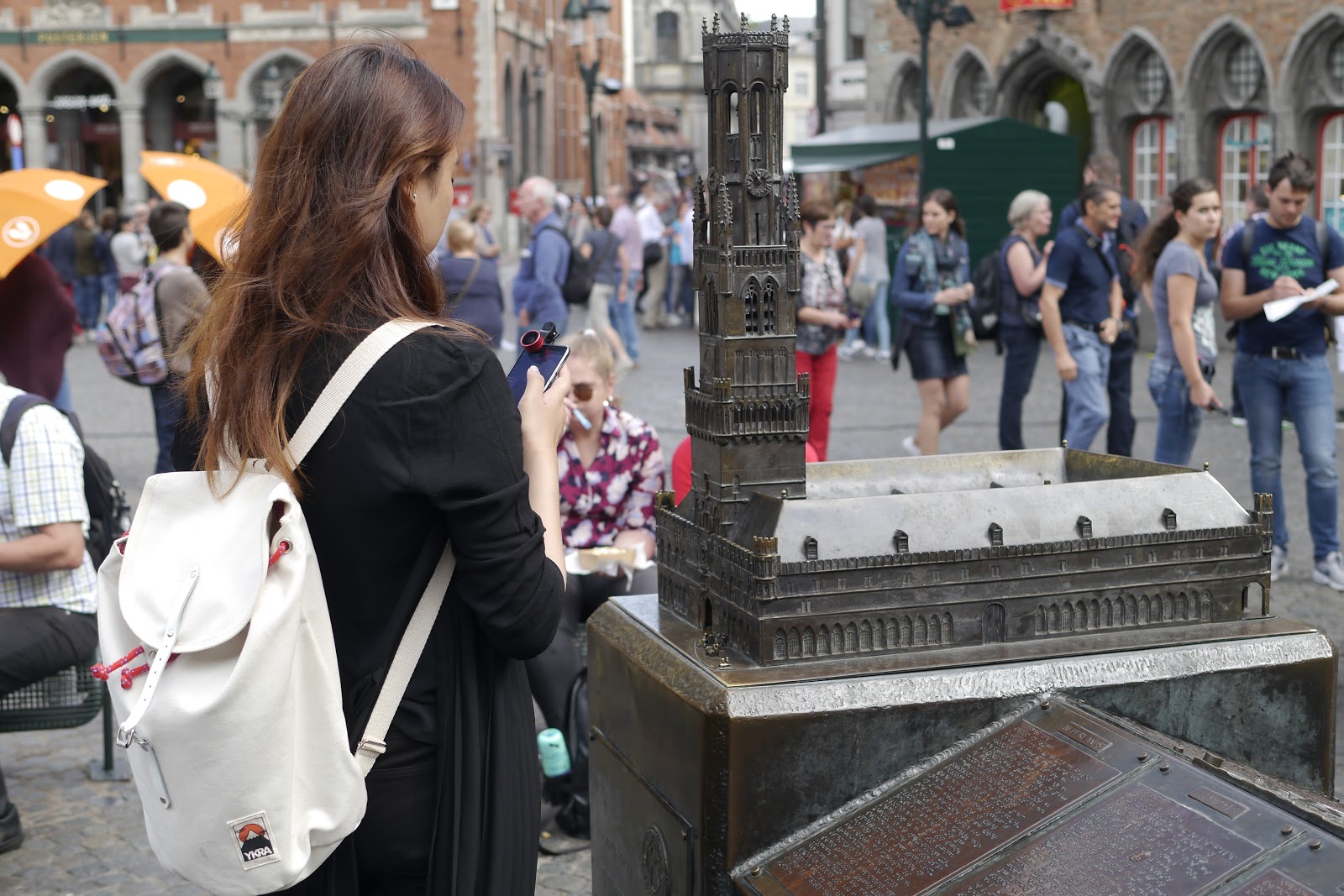 在市集廣場的中央,矗立著揚·布雷德爾(Jan Breydel)和彼得·德·科寧克(Pieter de Coninck)的雕像。