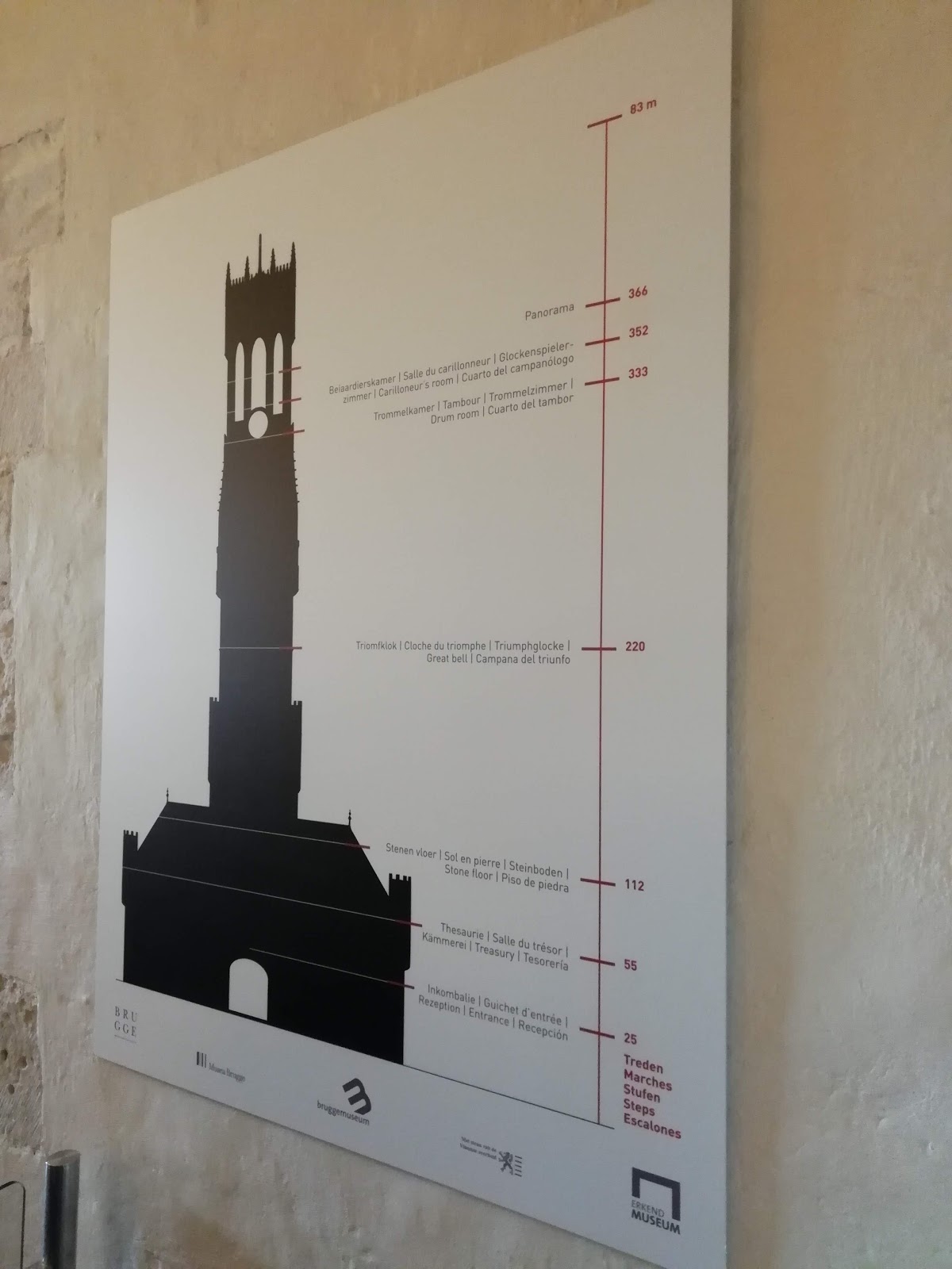 布魯日鐘樓過去用來收藏珍寶和市政檔案,以及用來觀測火情及其他危險狀況。366級狹窄陡峭的台階通往83米高的頂部(大約向東傾斜1米)。