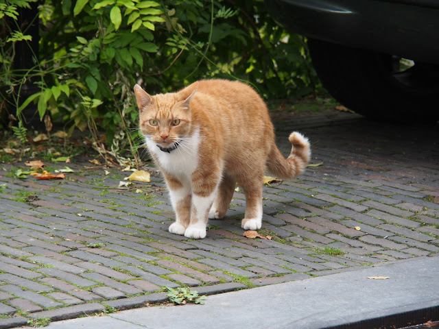 ▲路上遇見一隻店貓走到人行道上悠閒散步